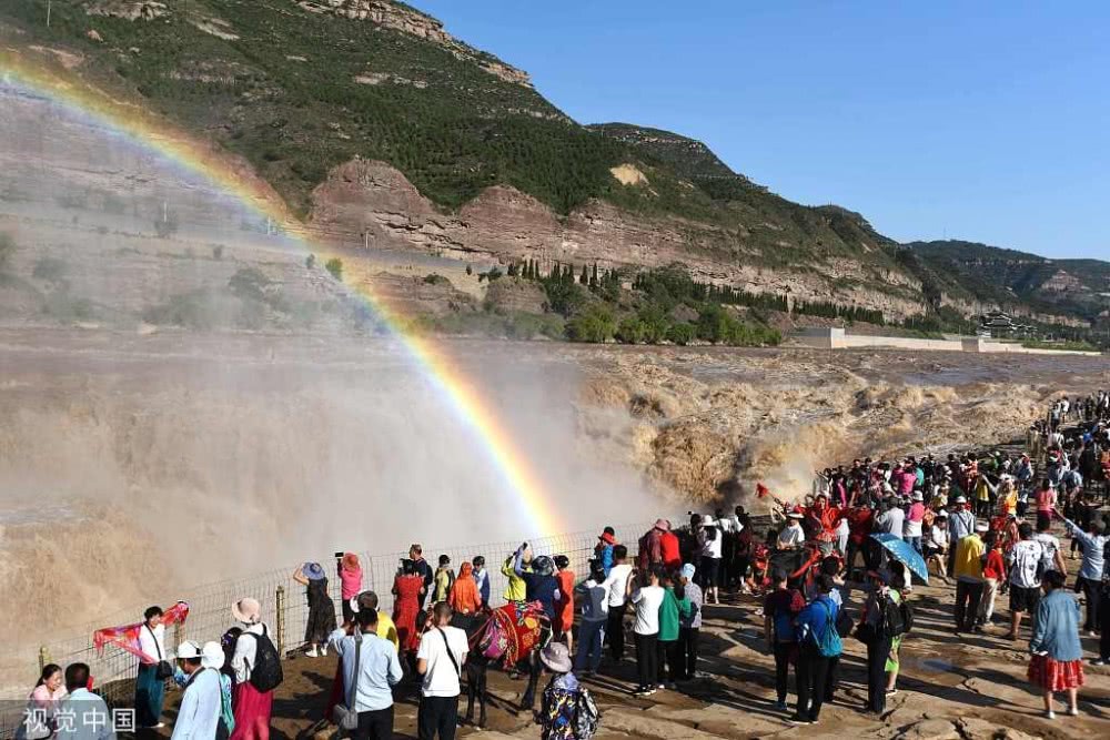 入秋以來,山西吉縣黃河壺口瀑布景區(qū)天氣晴好,黃河干流水量豐沛,壺口瀑布飛濺的浪花和水霧在陽光的照射下,形成“彩虹門”景觀,吸引了眾多游客。