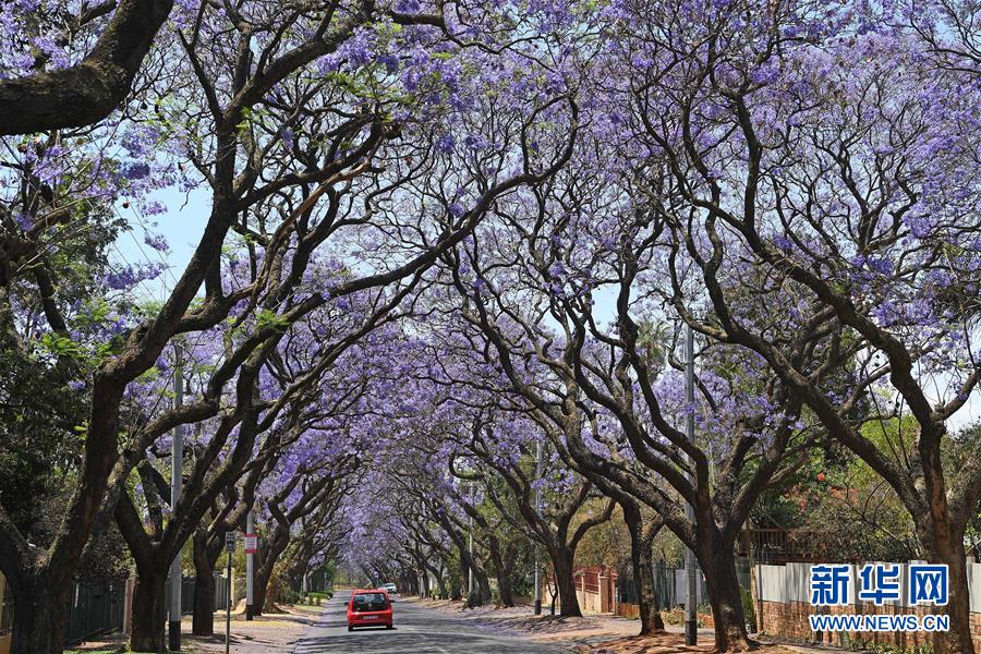 10月20日,在南非比勒陀利亞,車(chē)輛從藍(lán)花楹樹(shù)下駛過(guò)。新華社記者陳誠(chéng)攝
