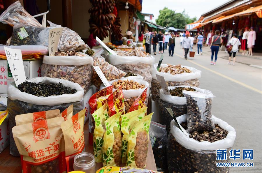 在龍巖市永定區(qū)湖坑鎮(zhèn)高頭鄉(xiāng)高北村的土樓風(fēng)情一條街,當(dāng)?shù)卮迕癜炎约荷a(chǎn)的各式農(nóng)產(chǎn)品向參觀游客進(jìn)行銷售(5月4日攝)。新華社記者魏培全攝