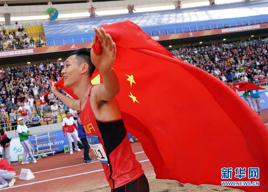 10月24日,中國選手王嘉男在比賽后慶祝。 當(dāng)日,在武漢舉行的第七屆世界軍人運(yùn)動會田徑項(xiàng)目男子跳遠(yuǎn)決賽中,中國選手王嘉男、黃常洲分別以8米15和8米12的成績獲得冠亞軍。 新華社記者金良快攝