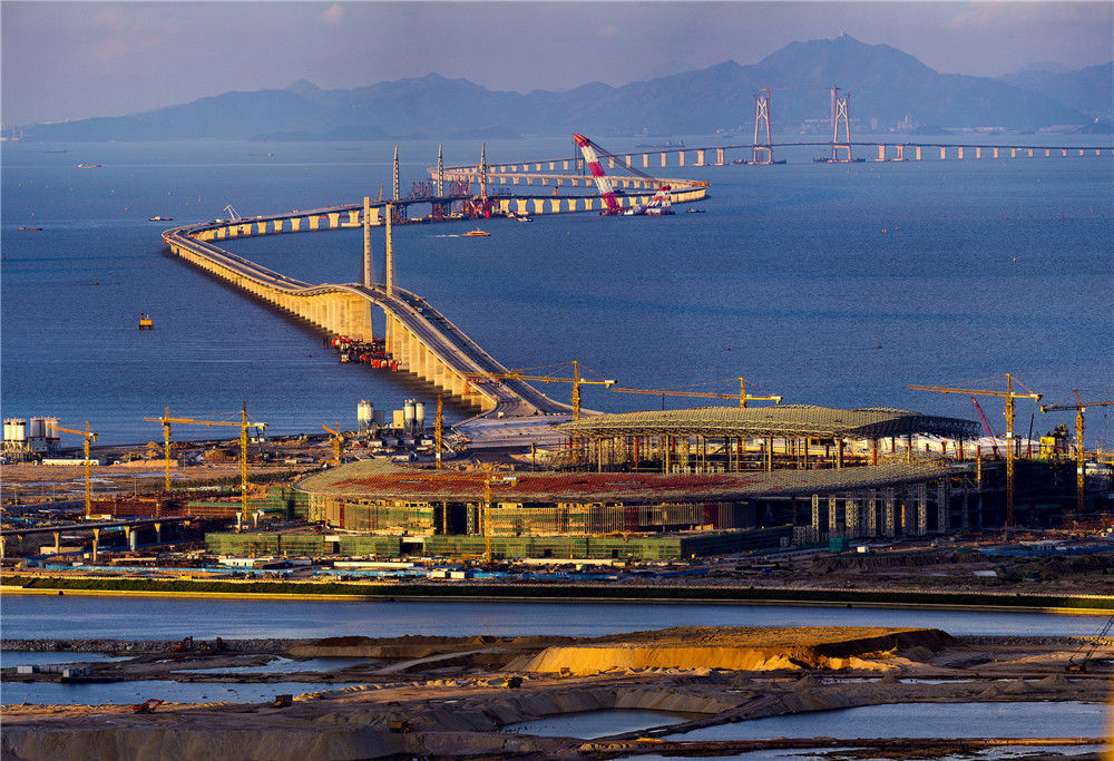 晨曦中的港珠澳大橋珠澳口岸人工島(10月24日無人機(jī)拍攝)。2018年10月23日,港珠澳大橋正式開通。在這座圓夢橋、同心橋、自信橋、復(fù)興橋開通一周年之際,記者親自體驗“一橋連三地、一日游三城”的悠閑與便利,于不同的旖旎風(fēng)光中自在游覽,在不同的城市風(fēng)貌間自如切換。新華社記者張金加攝