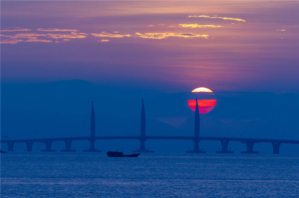 2018年10月22日早晨,從廣東珠海市的情侶路向東眺望,一輪紅日從東方冉冉升起,將港珠澳大橋映射得格外迷人。“超級工程”港珠澳大橋?qū)⒂?4日上午9時正式通車。張煒(香港分社)/中新社/視覺中國