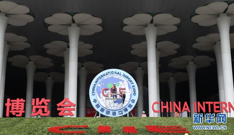 10月25日,施工人員在國展中心(上海)南廣場安裝進博會標志。 新華社記者 方喆攝