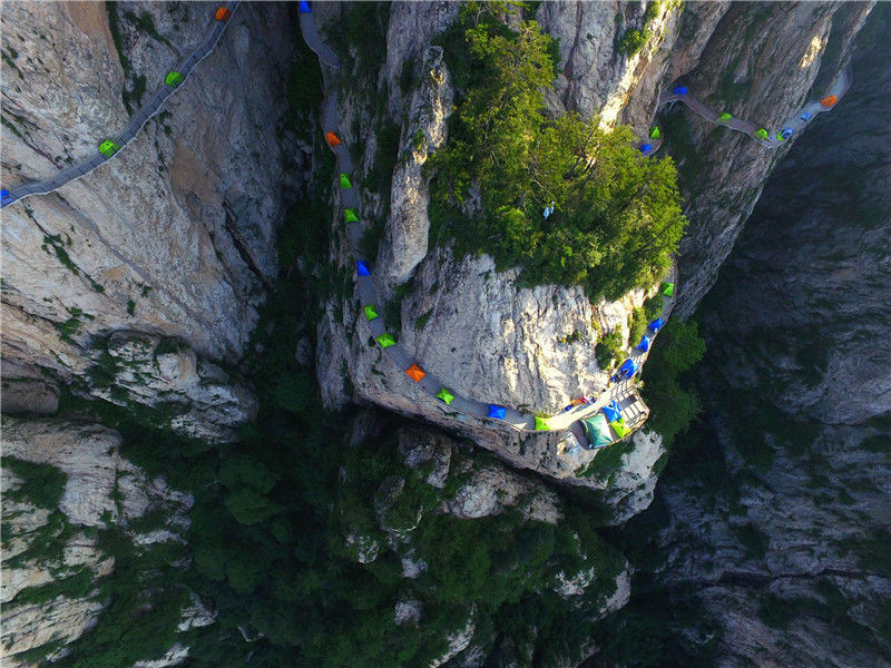 2018年7月21日,河南洛陽老君山,一年一度的帳篷節(jié)開幕,驢友在海拔2000余米的懸崖棧道上安營扎寨。DF/視覺中國