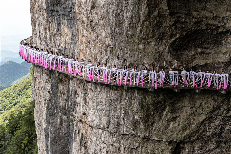 2018年7月29日,水袖舞愛好者在重慶市南川區(qū)金佛山絕壁棧道上“秀”水袖舞。瞿明斌/視覺中國