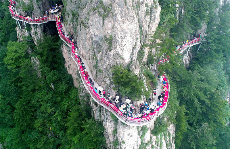 2018年7月8日,河南洛陽老君山舉行觀海避暑節(jié),在半山腰海拔2000米的懸崖棧道上安排了一場(chǎng)“云海盛宴”,設(shè)下免費(fèi)午餐,讓民眾免費(fèi)品嘗蘑菇山珍、大蝦、時(shí)令水果、新鮮果汁,精美點(diǎn)心等。DF/視覺中國(guó)