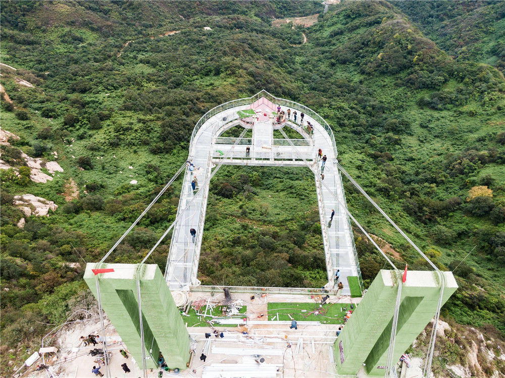 2019年9月20日,從落差198米懸崖上伸出周長(zhǎng)60米懸空的“高空玻璃懸廊”在河南南陽(yáng)七峰山落成,該玻璃懸廊名為“云頂之心”。