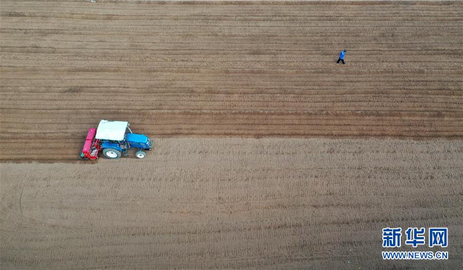 在河南省鞏義市西村鎮(zhèn)滹沱村,農(nóng)民駕駛機(jī)械在農(nóng)田中播種(10月24日無(wú)人機(jī)拍攝)。新華社記者馮大鵬攝