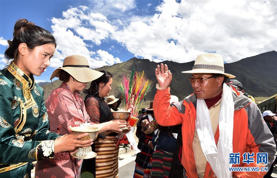 向來(lái)自遠(yuǎn)方的新鄰居敬獻(xiàn)青稞酒(2018年6月18日攝)。經(jīng)過(guò)兩天的馳騁,11輛大巴和31輛大貨車緩緩駛?cè)肜_市堆龍德慶區(qū)古榮鄉(xiāng)嘎沖村,標(biāo)志著西藏首個(gè)高海拔生態(tài)搬遷項(xiàng)目正式實(shí)施。新華社記者覺(jué)果攝