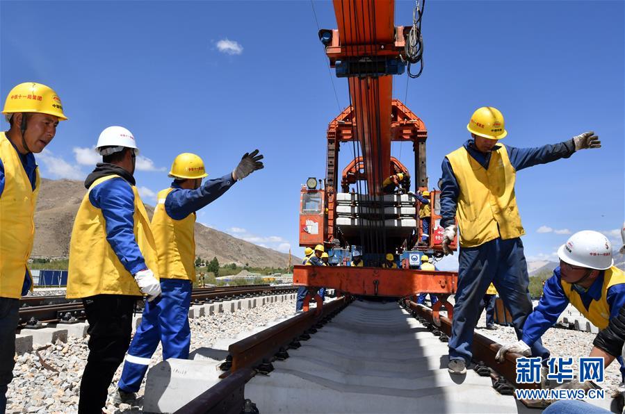 6月6日,負(fù)責(zé)鋪軌的中鐵十一局集團(tuán)的建設(shè)者在現(xiàn)場(chǎng)作業(yè)。新華社記者覺果攝