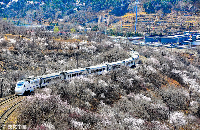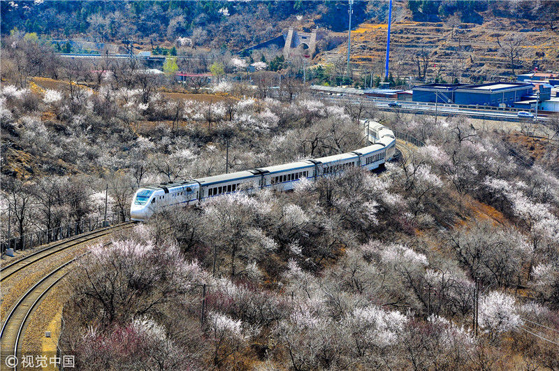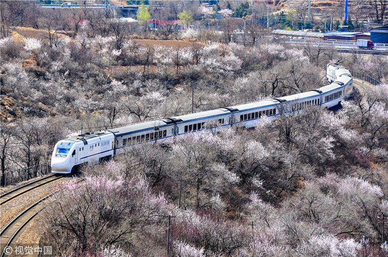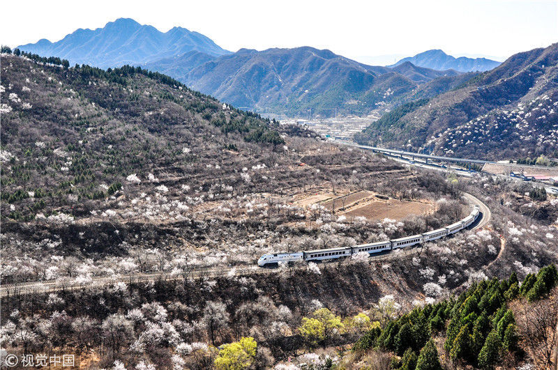 2019年3月22日,北京居庸關(guān)附近的山花盛開,S2線列車穿行在花海之中,構(gòu)成一幅美麗的畫面。時永平/千龍圖像/視覺中國編輯/陳進(jìn)