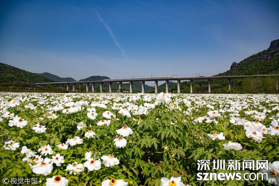 2019年4月8日,一列高鐵列車從京福高鐵安徽銅陵段一片盛開的鳳丹花海中駛過。