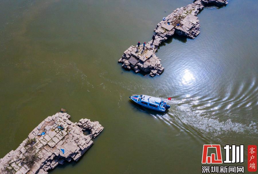 2019年10月30日,江西仙女湖旅游股份有限公司測量人員乘坐工作船對明代萬年橋進行測量,該橋橋身凸出水位最高處達1.64米。