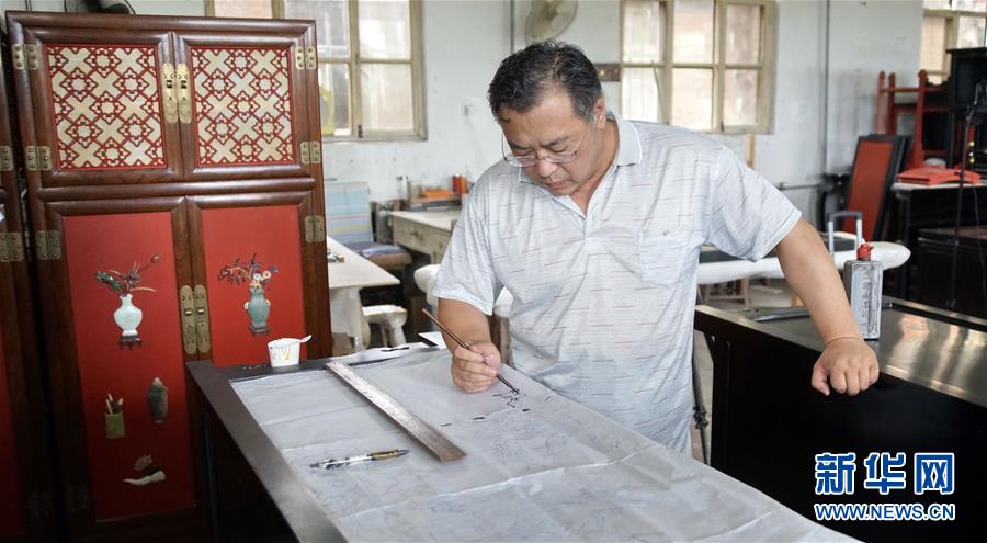 北京金漆鑲嵌有限責(zé)任公司工藝美術(shù)大師王學(xué)兵在繪制漆畫(huà)的底圖(10月31日攝)。新華社記者李欣攝