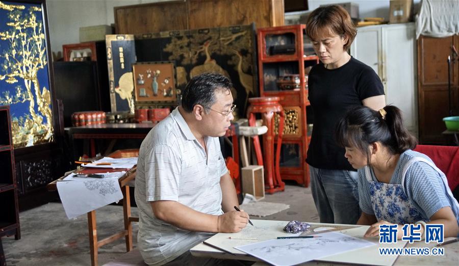 北京金漆鑲嵌有限責(zé)任公司工藝美術(shù)大師胡昕(右)在向?qū)W生傳授漆畫(huà)技藝(9月19日攝)。新華社記者李欣攝