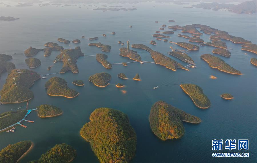 11月9日無人機拍攝的廬山西海。 當(dāng)日,落日余暉下的江西廬山西海山青水藍,美不勝收。 新華社記者 周密 攝