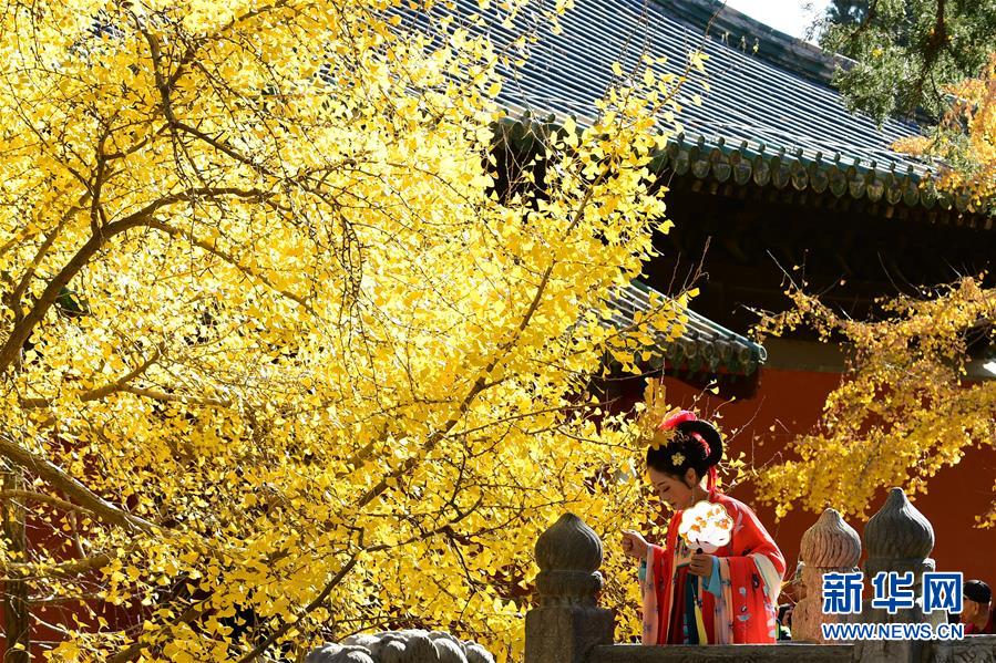 11月11日,一名漢服愛好者在大覺寺內(nèi)的古銀杏樹旁留影。新華社記者尹棟遜攝