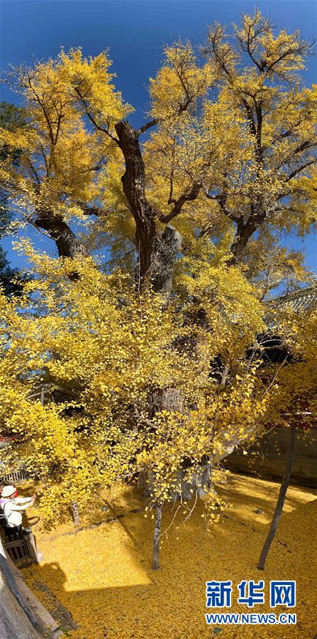 11月11日,人們?cè)诖笥X寺內(nèi)的古銀杏樹旁留影。新華社記者尹棟遜攝