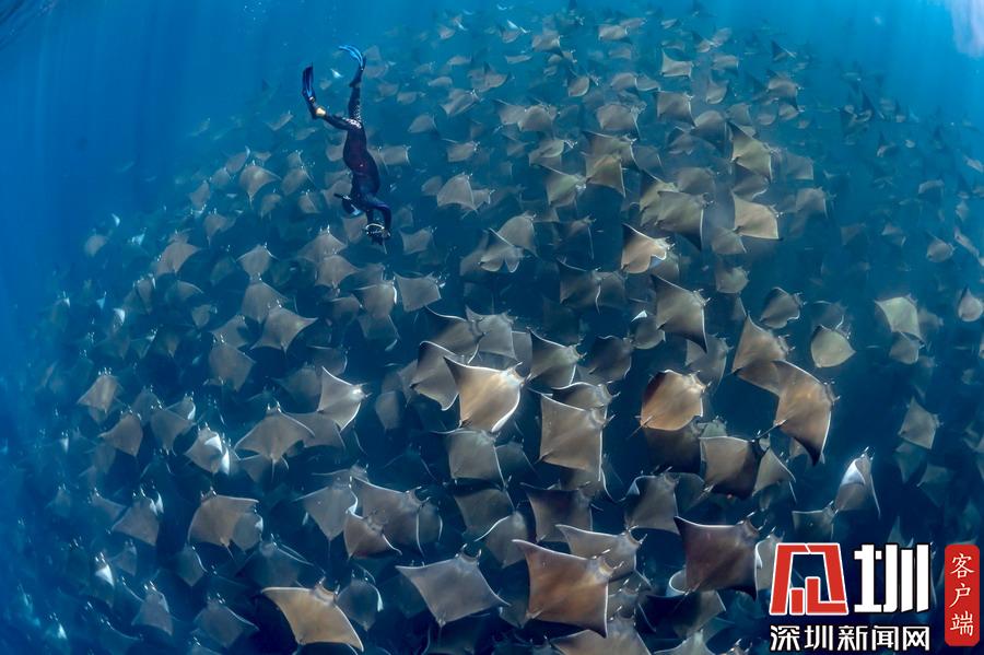 2019年5月31日報(bào)道(圖片拍攝于4月23日),環(huán)?;顒?dòng)家兼潛水教練Jay Clue上個(gè)月在墨西哥下加利福尼亞州洛斯卡沃斯附近海岸,幸運(yùn)地邂逅了一支蝠鲼遷徙大軍,數(shù)百只蝠鲼浩浩蕩蕩在海水中行進(jìn),畫面十分震撼。