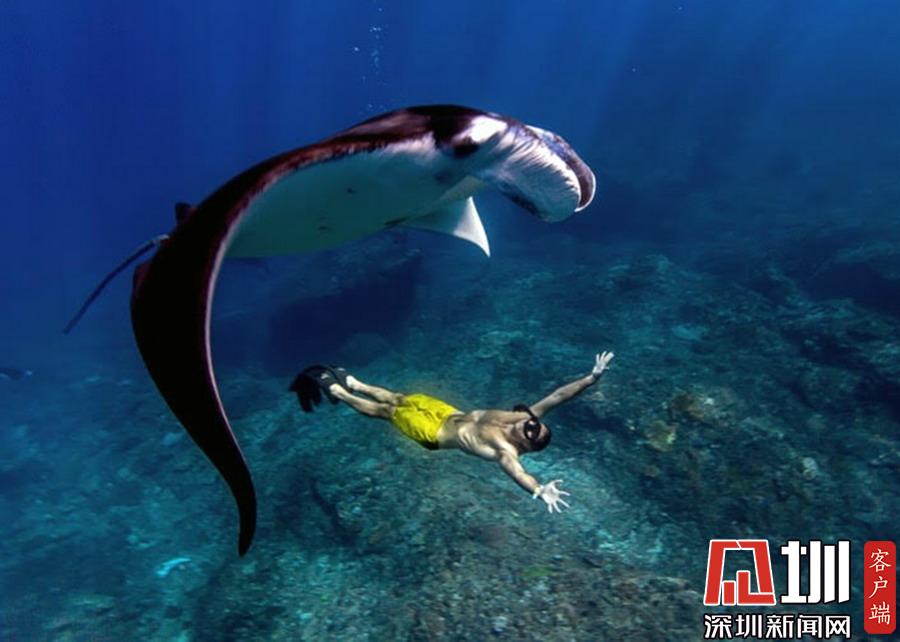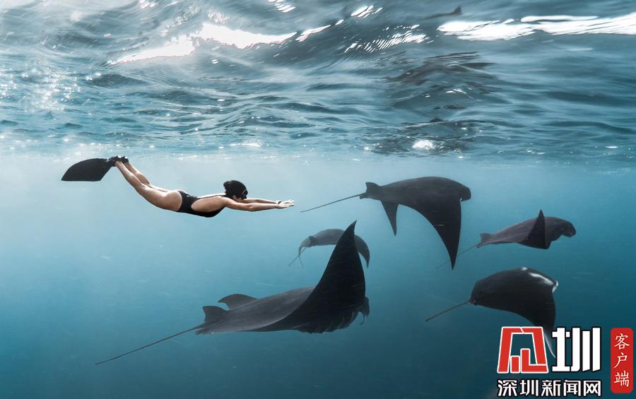 2019年7月2日報(bào)道(具體拍攝時(shí)間不詳),印度尼西亞科莫多國家公園,美國自由潛水愛好者Kristina Zvaritch一次潛水時(shí),她的正下方恰巧游著幾只巨大的蝠鲼,這令人驚艷的一幕恰巧被她的丈夫拍下來了。當(dāng)她看到這些照片時(shí),自己都被驚呆了。晶瑩剔透的海水使這張照片有了視覺錯(cuò)位的效果,讓人以為Kristina與這些魚處于相同的高度,但實(shí)際上她離這些魚還有10-19英尺左右的距離。