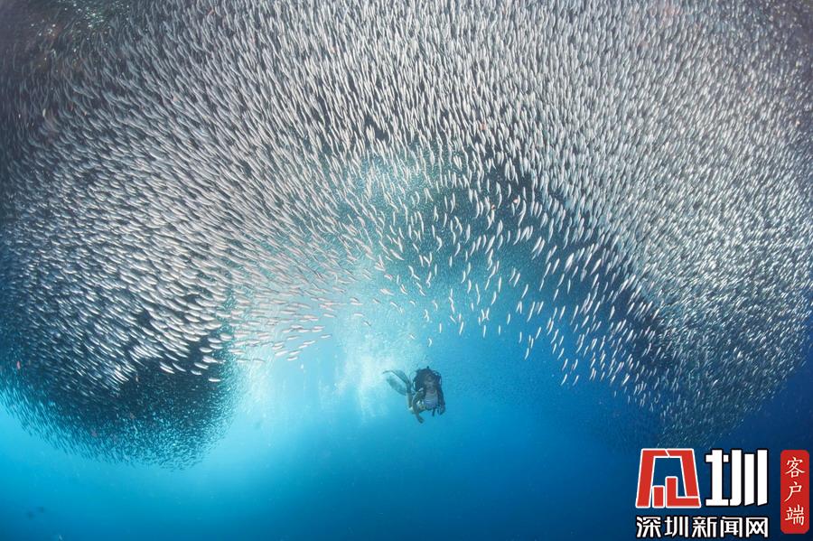 2018年12月24日報(bào)道(具體拍攝時(shí)間不詳),這張?bào)@艷的照片記錄了沙丁魚大軍為一位幸運(yùn)的潛水員讓路的瞬間,數(shù)百萬條銀光閃閃的小魚兒簇?fù)韲@在他的一側(cè),恰似熠熠生輝的繁星,如眾星捧月一般畫面十分驚艷。