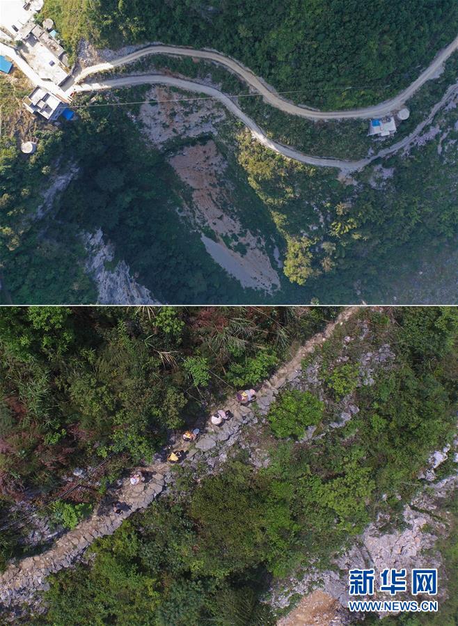 拼版照片:上圖為剛剛修通公路的大化瑤族自治縣板升鄉(xiāng)八好村弄麻屯(11月11日無人機(jī)拍攝);下圖為在尚未通路的八好村弄麻屯,孩子們爬山路回家(2016年9月23日攝)。新華社記者 黃孝邦 攝