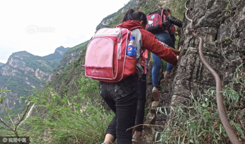 上學(xué)的孩子都背著沉沉的書包,大多數(shù)是女孩,15個(gè)孩子在三個(gè)家長(zhǎng)的保護(hù)下,大約用了2個(gè)小時(shí),到達(dá)“懸崖村”。上山容易下山難,遇到雨雪天氣,村里人就不再外出了。 圖片來源:視覺中國(guó)