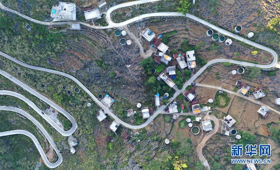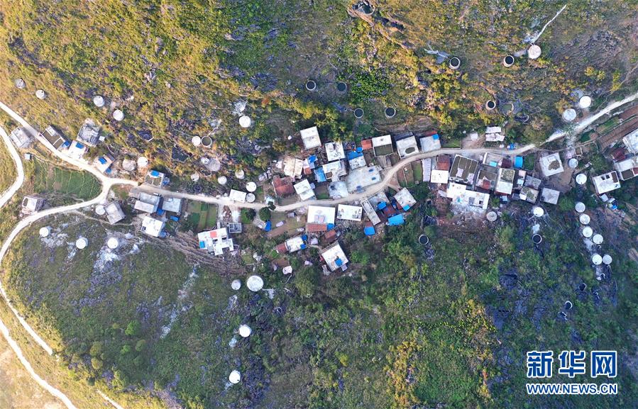 廣西大化瑤族自治縣七百弄鄉(xiāng)弄騰村群眾的家庭水柜分布在房前屋后(11月9日無(wú)人機(jī)拍攝)。新華社記者黃孝邦攝