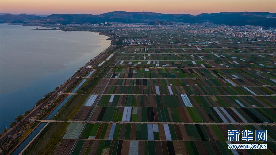 這是云南省玉溪市通??h的田園風(fēng)光(11月23日無人機拍攝)。初冬時節(jié),云南省玉溪市通??h風(fēng)景秀麗,山巒、湖水與農(nóng)田組成了一幅美麗的田園詩畫卷。新華社記者胡超攝