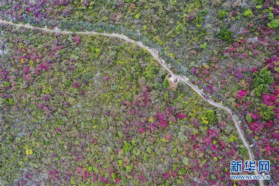 11月23日,游客在位于長江巫峽段的巫山文峰景區(qū)游覽(無人機(jī)拍攝)。初冬時(shí)節(jié),位于重慶巫山縣境內(nèi)的長江巫峽段呈現(xiàn)出一江碧水東流、兩岸層林盡染的秀美景象。新華社記者王全超攝