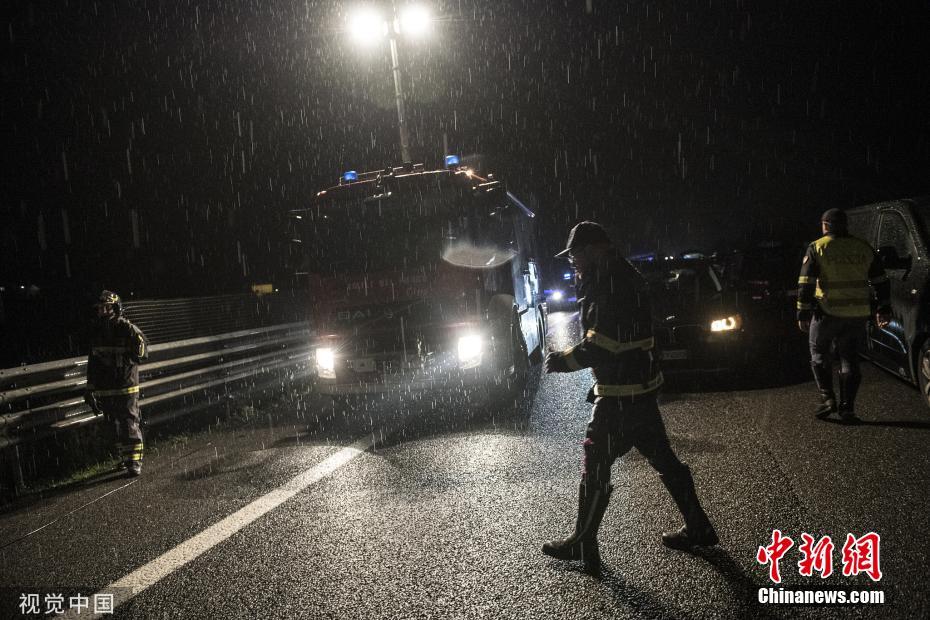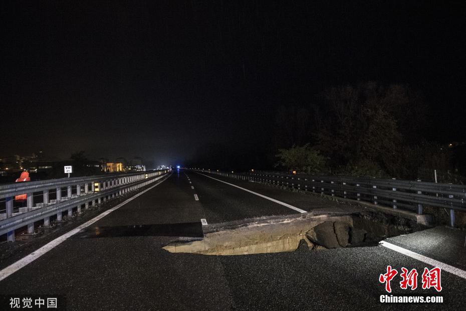 當(dāng)?shù)貢r(shí)間2019年11月24日,意大利Villafranca dAsti,意大利遭受惡劣天氣和持續(xù)多日的暴雨,通往都靈方向的A21高速公路路面出現(xiàn)“大坑”。圖片來源:視覺中國(guó)