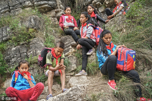 5月14日是家長接孩子的日子,清晨6點多,30多歲的陳古吉帶著背包繩和另外兩個家長一起下山接孩子。村里身手敏捷的年輕人,下山通常需要1小時,上山大約90分鐘,對于外來的人,通常是這個時間的兩倍。圖片來源:視覺中國