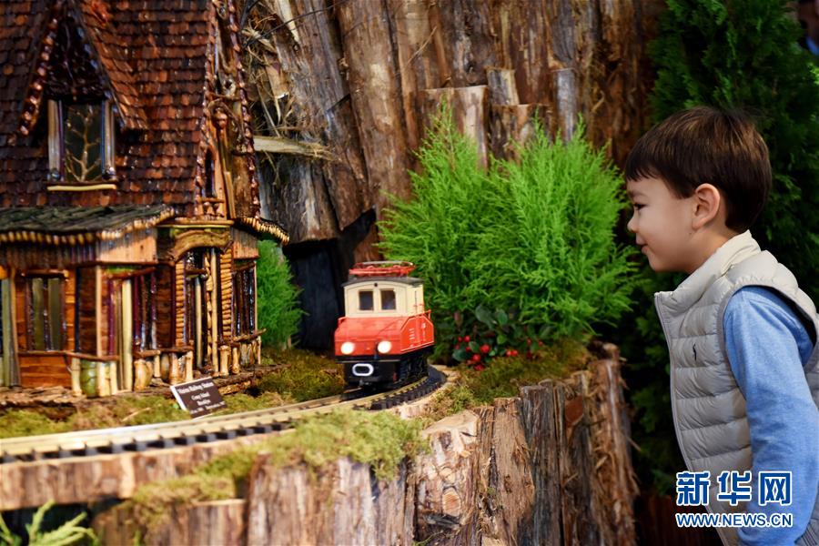 11月26日,在美國紐約植物園節(jié)日小火車展上,游客觀看模型小火車和紐約微縮景觀。新華社記者韓芳攝