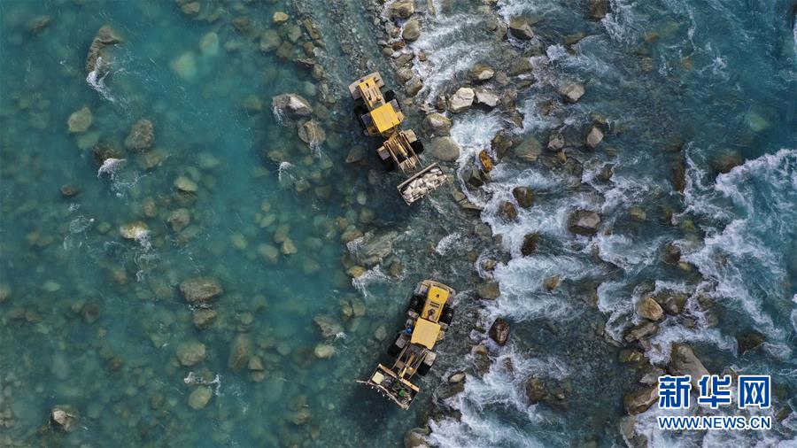 在新疆塔什庫爾干塔吉克自治縣大同鄉(xiāng)庫如克欄桿村,電力工人利用施工車輛運送水泥、鐵塔零件過河,為鋪設(shè)線路做準(zhǔn)備(11月24日無人機(jī)拍攝)。