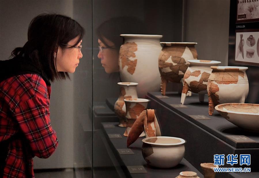 參觀者在二里頭夏都遺址博物館內(nèi)觀看展出的陶器(10月19日攝)。新華社記者李安攝