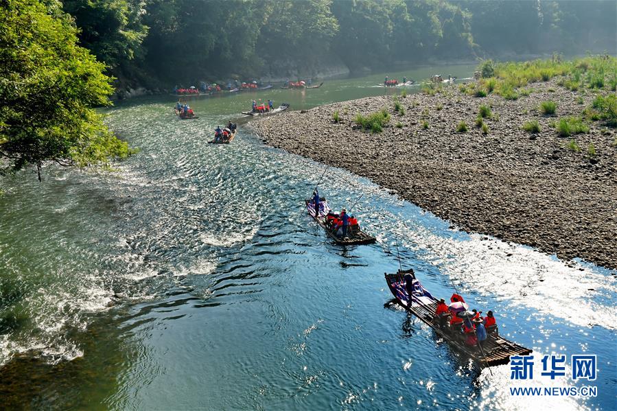 8月23日,游客在武夷山九曲溪乘竹筏游覽。暑期即將接近尾聲,福建武夷山游客仍絡(luò)繹不絕。盡管2019年暑期武夷山兩次遇到暴雨災(zāi)害造成景區(qū)關(guān)閉,在當(dāng)?shù)芈糜尾块T的努力下很快恢復(fù)旅游秩序。新華社記者張國俊攝