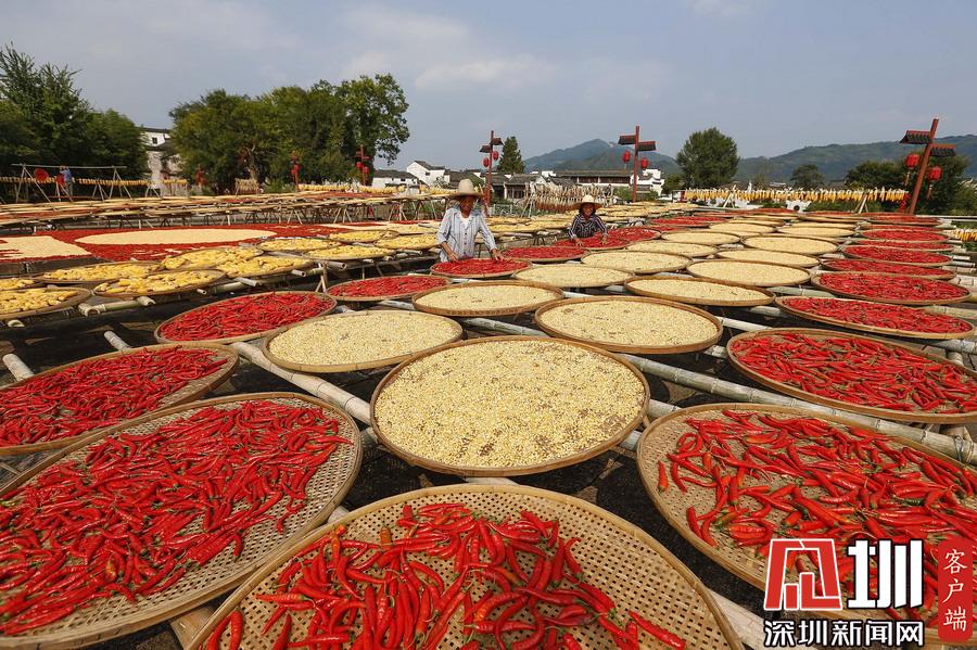 2019年9月9日,安徽黃山,呈坎古村村民在曬場(chǎng)上晾曬農(nóng)作物。