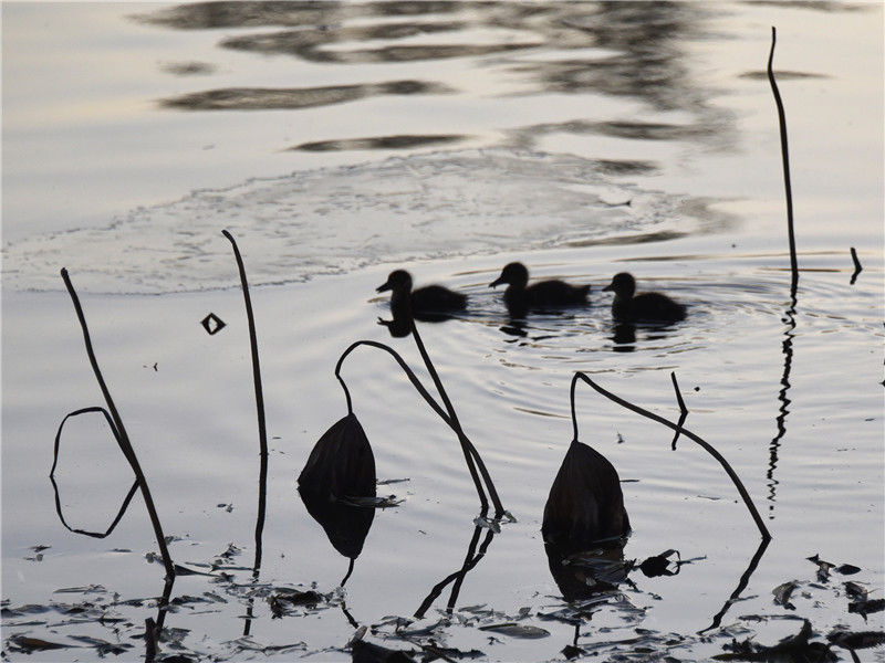 2019年12月2日,北京玉淵潭公園湖畔,三只野鴨寶寶在冰面上行走、湖中游弋,呆萌可愛(ài)。杜佳/視覺(jué)中國(guó) 編輯/陳進(jìn)