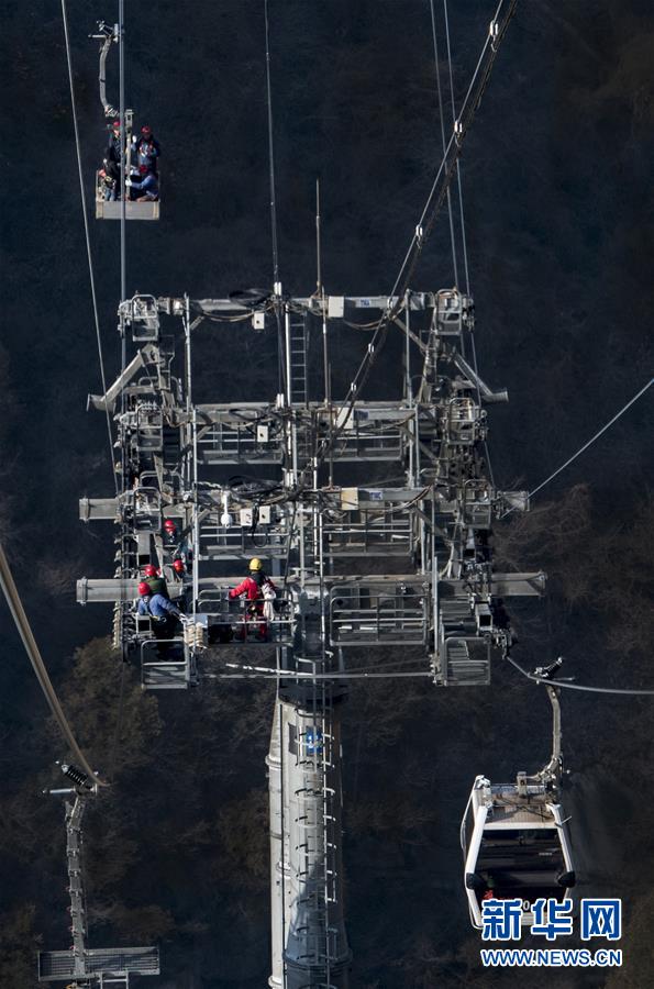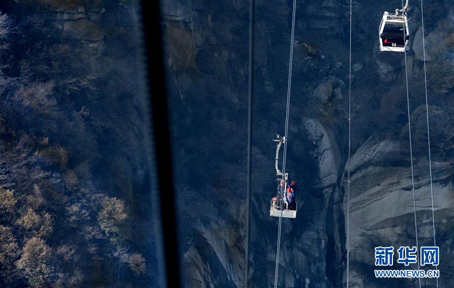 華山太華索道維修人員對(duì)索道支架及鋼絲繩進(jìn)行檢測(cè)(12月6日攝)。新華社記者陶明攝