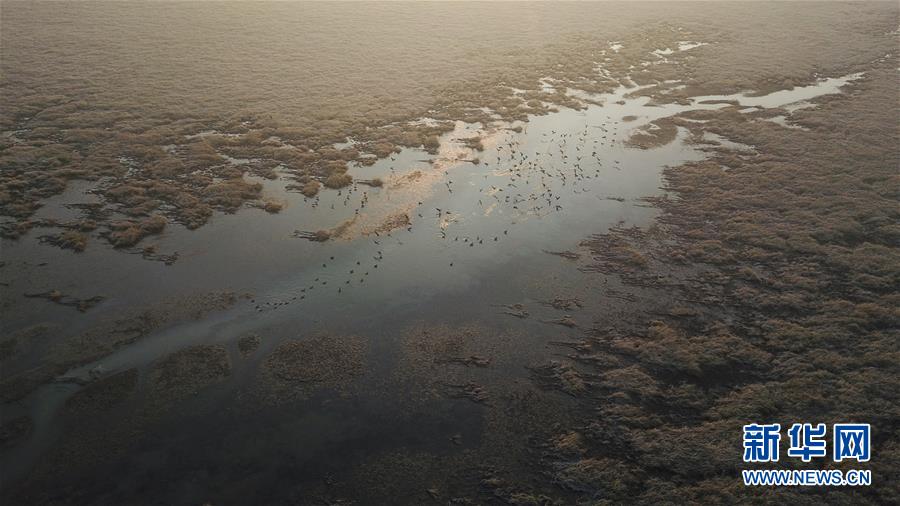 12月7日,一群候鳥在升金湖停留(無人機拍攝)。新華社記者張端攝