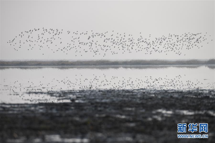 一群候鳥在升金湖上空飛翔(12月7日拍攝)。新華社記者張端攝