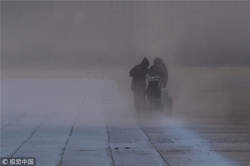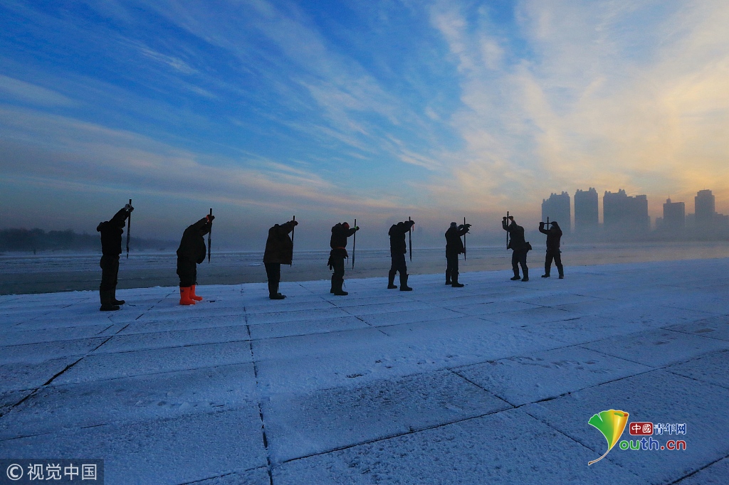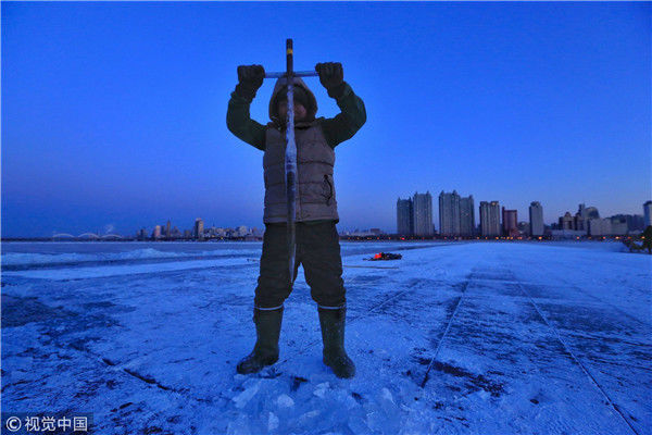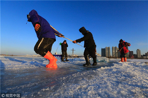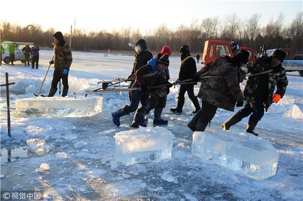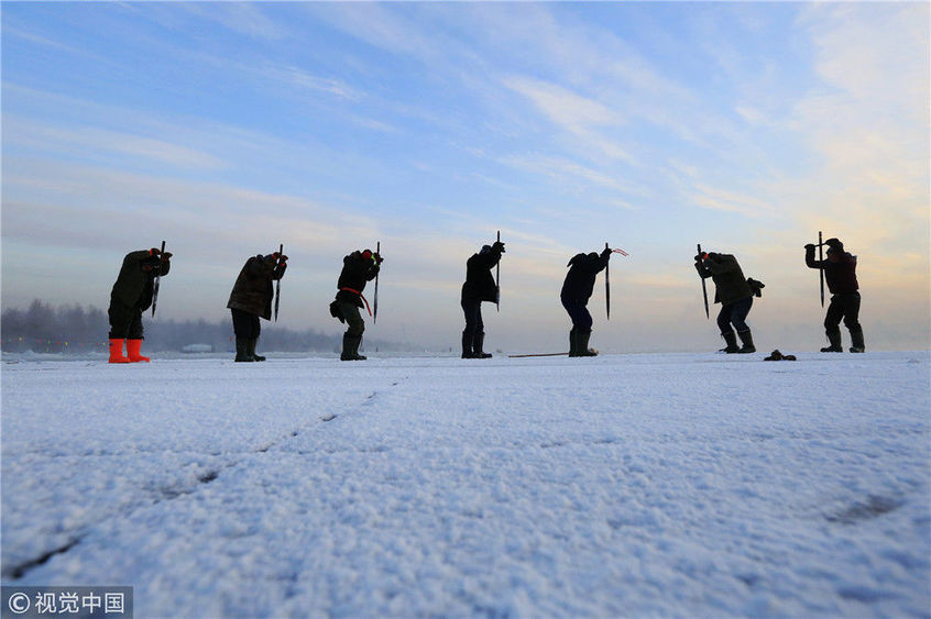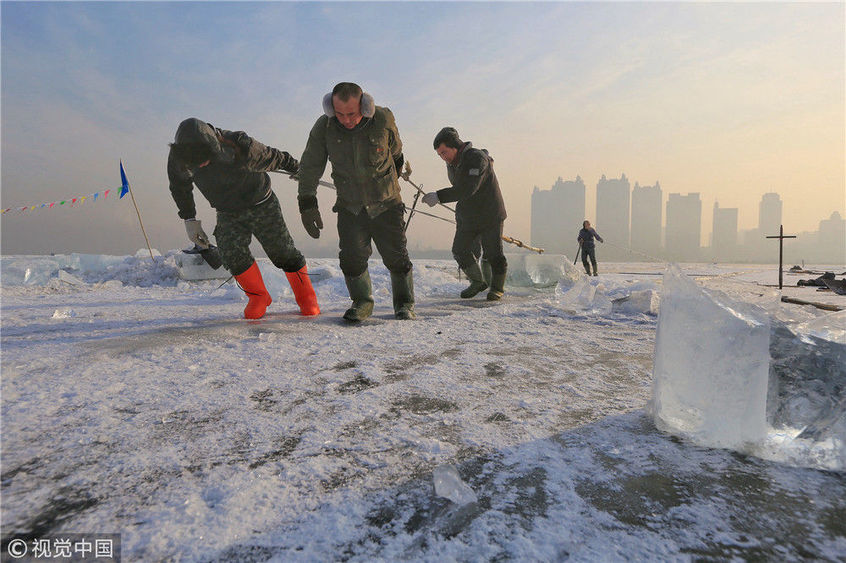 2018年12月11日,黑龍江省哈爾濱市,松花江上,采冰者們彎腰拉繩,宛如纖夫般拽重達半噸的冰塊出水。采冰者都是自哈市江北萬寶、東發(fā)、沙陀子等鄉(xiāng)鎮(zhèn)的農(nóng)民,他們每年冬閑時都會親屬、村鄰之間結(jié)伴到松花江畔采冰,有的采冰人,已經(jīng)連續(xù)干了二十多年。每個采冰季,他們每天要在冰面上工作10-12個小時,每個采冰組,一天要拽出冰塊2000-3000塊,一個近20天的采冰季,每人能收入近萬元。視覺中國