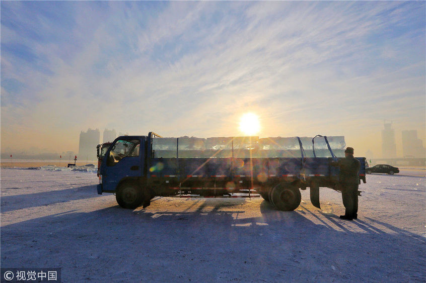 2018年12月8日,最低氣溫零下22度,哈爾濱市江北公路大橋東側(cè)的江面上,工人們正在從江中撈取冰塊,裝車運往景區(qū)制作冰燈、冰雕?,F(xiàn)場,工人先是用電鋸、鐵釬將冰分割成半米多寬,一米多長的冰塊,接著將其拉出水面。等候在旁的叉車上前,將冰裝上運冰的卡車,之后裝滿冰塊的卡車駛往景區(qū)。