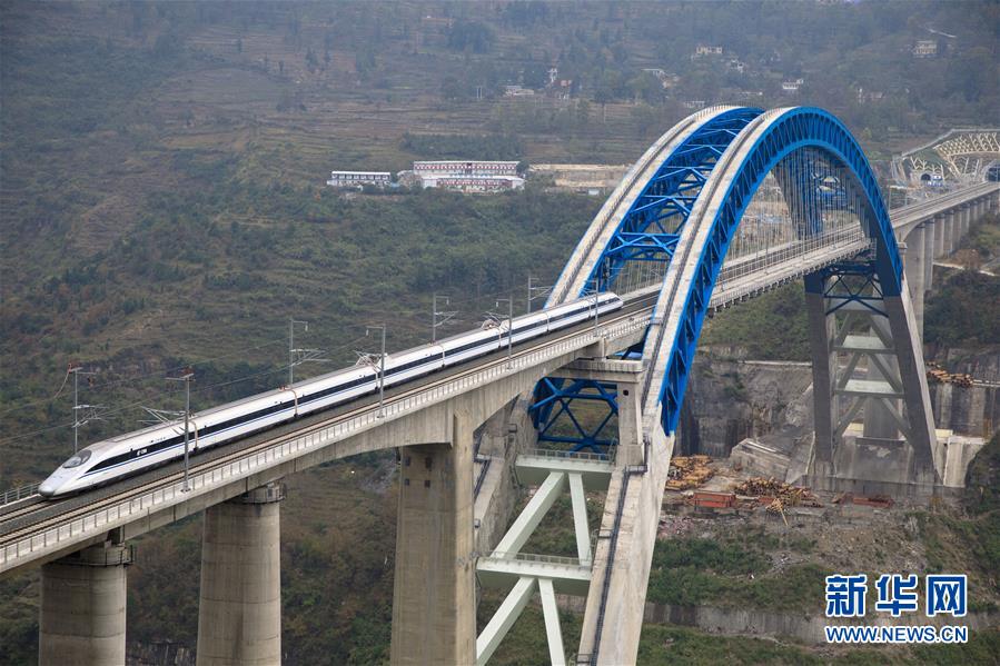 12月2日,一輛試驗(yàn)列車駛過成貴高鐵鴨池河特大橋。