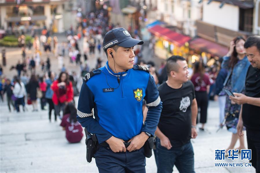 11月28日,澳門治安警察局旅游警察關(guān)天恒在大三巴牌坊附近巡邏,他已經(jīng)工作了2年,主要負責維持社會治安及解答游客問題。 新華社記者 張金加 攝