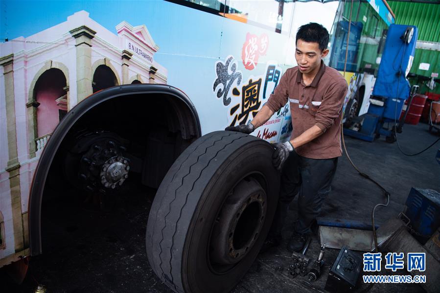 11月26日,澳門(mén)公共汽車(chē)股份有限公司鄭家松在推輪胎,他已經(jīng)工作了2年,主要負(fù)責(zé)為公交車(chē)做定期保養(yǎng)及維修。 新華社記者 張金加 攝