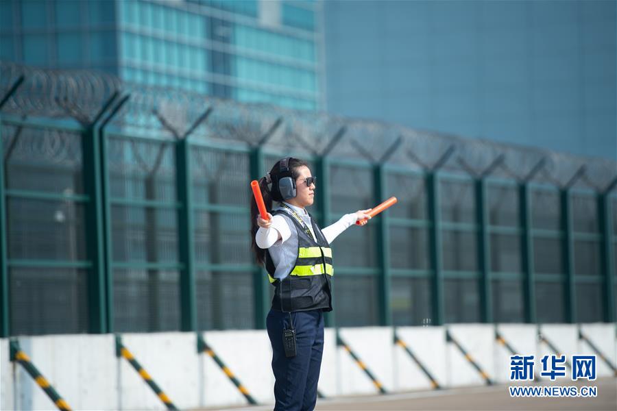 11月25日,澳門國際機(jī)場營運(yùn)員鄧祺君在機(jī)場指揮飛機(jī)停泊,她已經(jīng)工作了3年。 新華社記者 張金加 攝