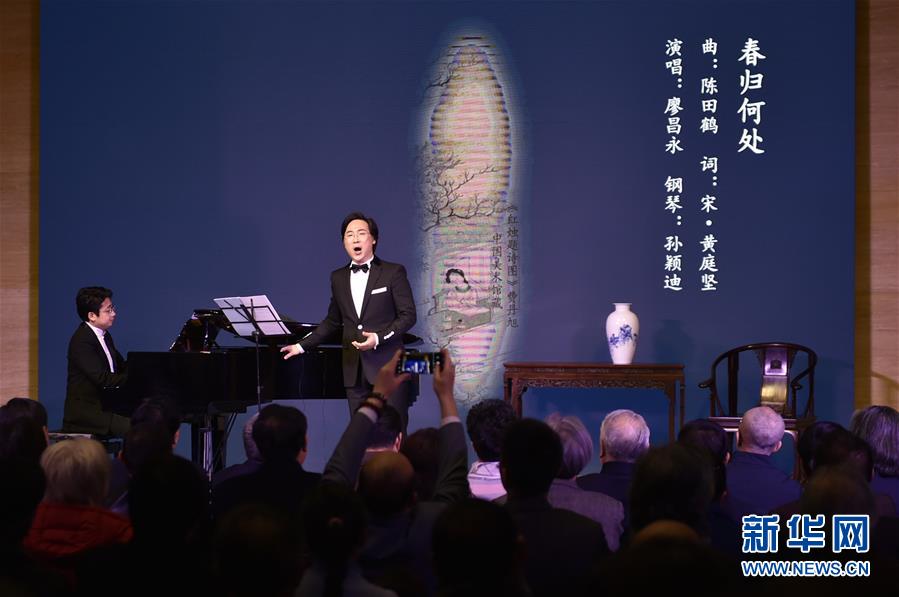 12月10日晚,廖昌永在音樂會上演唱《春歸何處》。 當(dāng)晚,中國古典詩詞與書畫——廖昌永中國藝術(shù)歌曲獨(dú)唱音樂會在北京中國美術(shù)館舉行。 新華社記者 魯鵬 攝