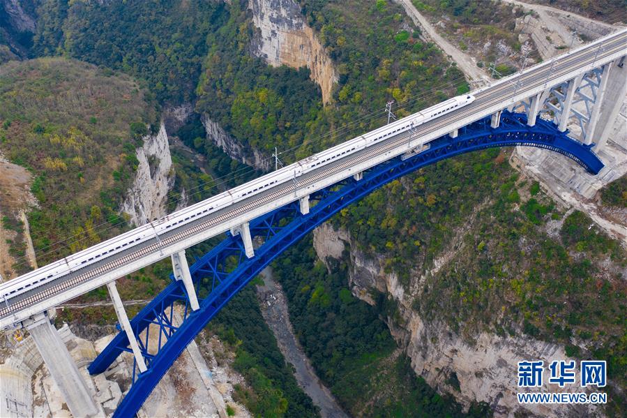 12月2日,一輛試驗列車駛過成貴高鐵鴨池河特大橋。當(dāng)日,正在進(jìn)行聯(lián)調(diào)聯(lián)試的成貴高鐵進(jìn)入全線拉通空載模擬運行階段,試驗列車將在成都到貴陽區(qū)間內(nèi)全線路運行。線路全長650公里的成貴高鐵是我國“八縱八橫”高速鐵路網(wǎng)的重要組成部分,設(shè)計時速為250公里。新華社記者劉續(xù)攝