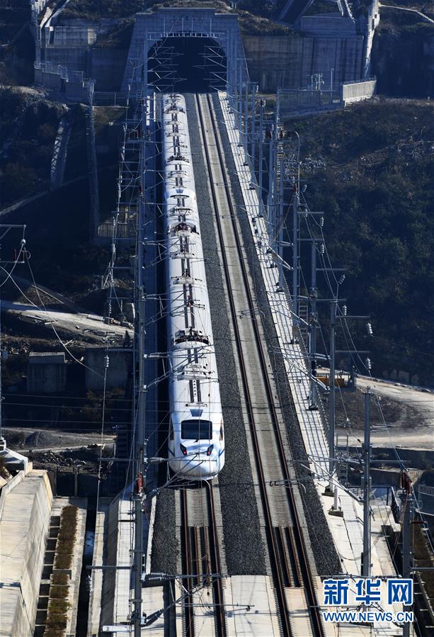 12月15日,一列試驗列車行駛在貴州清鎮(zhèn)市境內(nèi)的成貴高鐵線上。成(都)貴(陽)高鐵預(yù)計于12月16日全線正式開通運營。成貴高鐵線路全長650公里,是我國“八縱八橫”高速鐵路網(wǎng)的重要組成部分,設(shè)計時速為250公里。新華社記者楊文斌攝